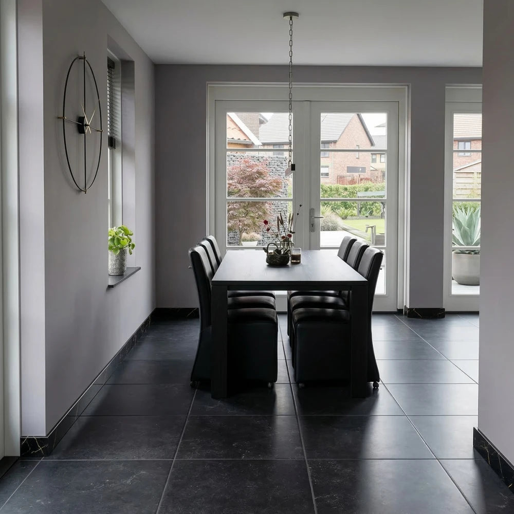 Finisajul Gold Black se remarca printr-o baza mata, eleganta, traversata de vene aurii cu reflexii fine, care prind lumina si dau profunzime intregii suprafete. Se potriveste excelent cu pardoseli din gresie sau marmura precum Sahara Noir, Nero Portoro, Noir Saint Laurent sau Nero Marquina, unde poate continua natural contrastul dintre tonurile inchise si accentele aurii. Se integreaza la fel de bine si in amenajari contemporane cu microciment, SPC sau rasini decorative. De asemenea, poate fi asociat armonios cu pereti finisati in tonuri calde si cu vopsele decorative de tip Swahili Gold.